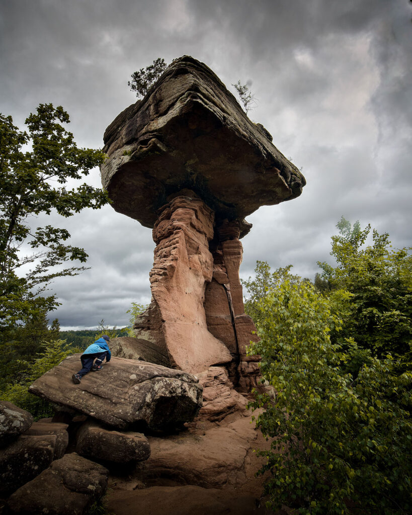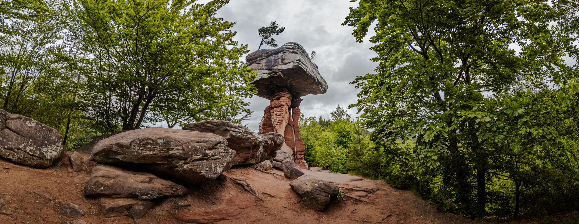 Wer im Pfälzerwald unterwegs ist, kommt an einem Motiv nicht vorbei: dem Teufelstisch bei Hinterweidenthal. Diese gigantische, 14 Meter hohe Felsformation sieht aus, als hätten Riesen dort ein bizarres Picknick veranstaltet. Für uns Fotografen ist dieser „Pilzfelsen“ (ein Geotop von nationalem Rang) eines der dankbarsten Motive im Pfälzerwald.